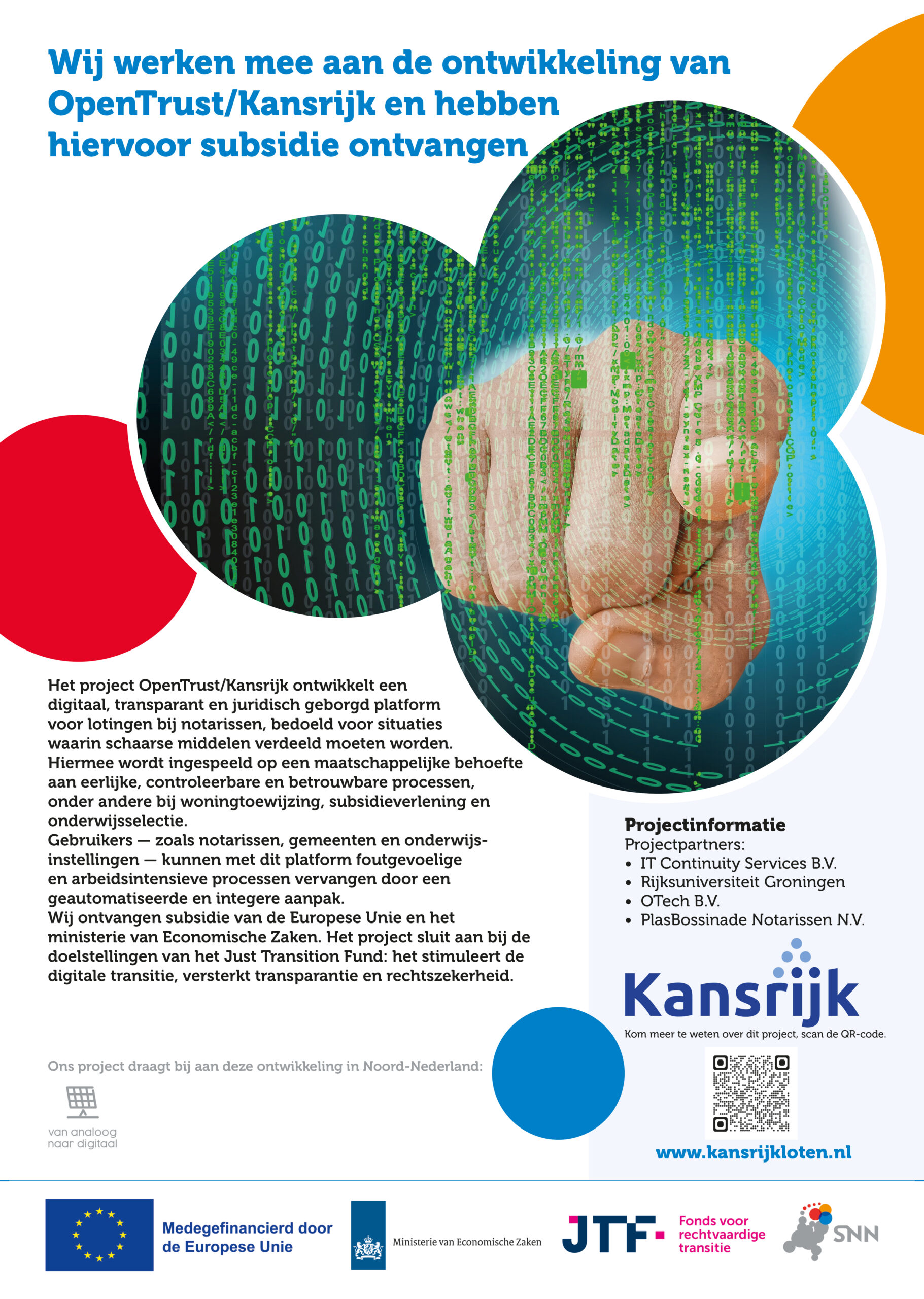 Wij ontvangen subsidie voor dit project van de Europese Unie en het ministerie van Economische Zaken via de SNN vanuit het Just Transition Fund. Het project sluit aan bij de doelstellingen van het Just Transition Fund: het stimuleert de digitale transitie, versterkt transparantie en rechtszekerheid.